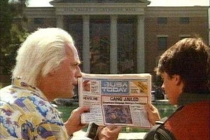 O filme também passou longe da realidade atual quando Marty foi avisado de uma prisão iminente por um jornal em papel, e não por uma tela touchscreen. Duas décadas antes, o filme "2001: Uma Odisseia no Espaço", de Stanley Kubrick, já tinha mostrado os "newspads". Mas um ativista que tenta restaurar a torre do relógio de Hill Valley até parece usar um tablet em uma das cenas do filme.